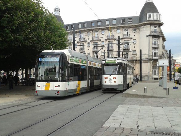 Het belangrijkste station van Gent is Gent Sint Pieters, waar ook alle tramlijnen samenkomen. Links zien we HermeLijn 6329 op lijn 24 voor het mooie stationsgebouw.