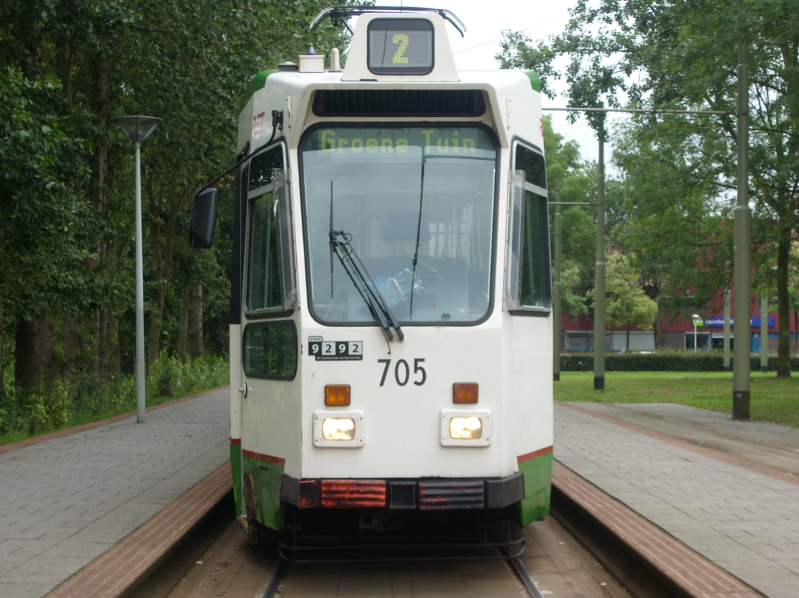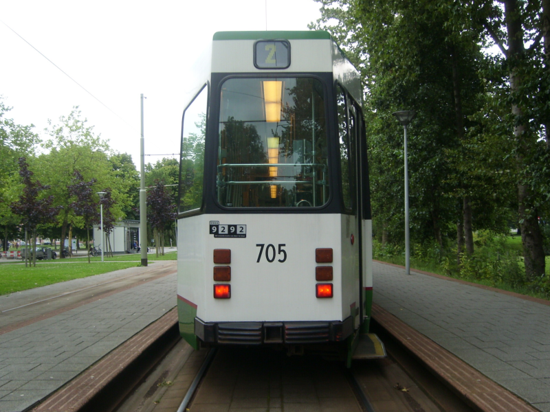 Vanaf 1993 werd er een nieuwe wit-groene kleurstelling (met rode details) ingevoerd. Op 28 juli 2009 trof ik de 705 in deze uitmonstering aan in de keerlus van lijn 2 aan de Kromme Zandweg. Klik om te vergroten.