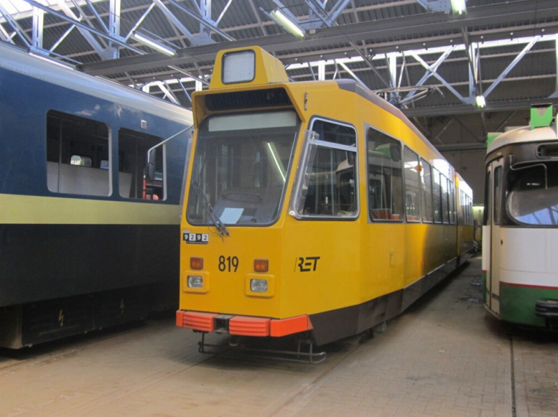Tussen '85 en '88 volgde de serie 800, die zijn gebouwd met draaistellen en andere onderdelen van de eerste serie Rotterdamse Düwag-trams uit de jaren '60. Naast de technische verschillen zijn de trams ook ongeveer een meter korter dan de 700-serie. Hoewel ze nieuwer waren dan de 700'en, zijn ze vanwege de oudere onderdelen eerder buiten dienst gesteld. De laatste tien 800'en zijn tot in 2012 ingezet, maar helaas heb ik er nooit een 'in het wild' gespot. Op 29 september 2012 kon ik wel de 819 vastleggen, die samen met de 834 en 840 is bewaard door Stichting RoMeO. Verder zijn er 26 exemplaren naar Roemenië vertrokken om daar ingezet te worden, de rest is gesloopt.