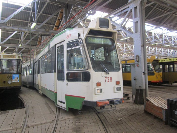 Omdat de museumremise te Hillegersberg voor 2014 nog eigendom van de RET was, is deze nog gebruikt om op sloop wachtend ZGT-materieel te stallen. Zo trof ik hier op 29 september 2012 de 728 aan.