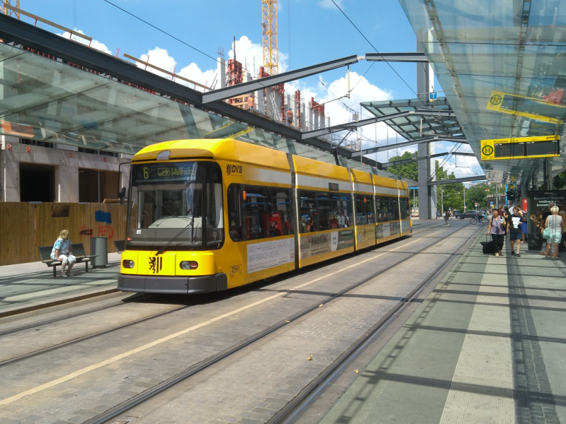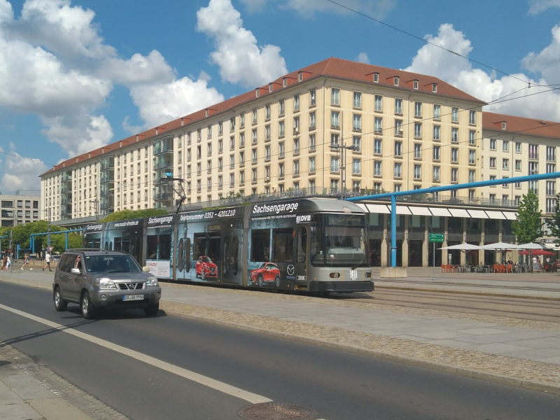 De trams van Dresden zijn normaal gesproken bijna volledig geel, maar er zijn ook uitzonderingen, zoals de 2509 met totaalreclame voor een Mazda-garage.