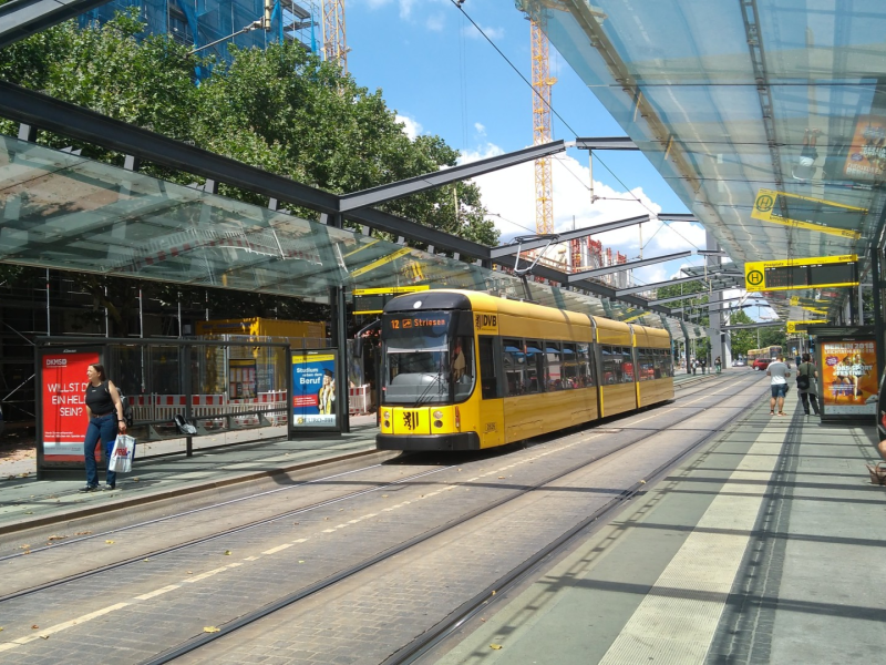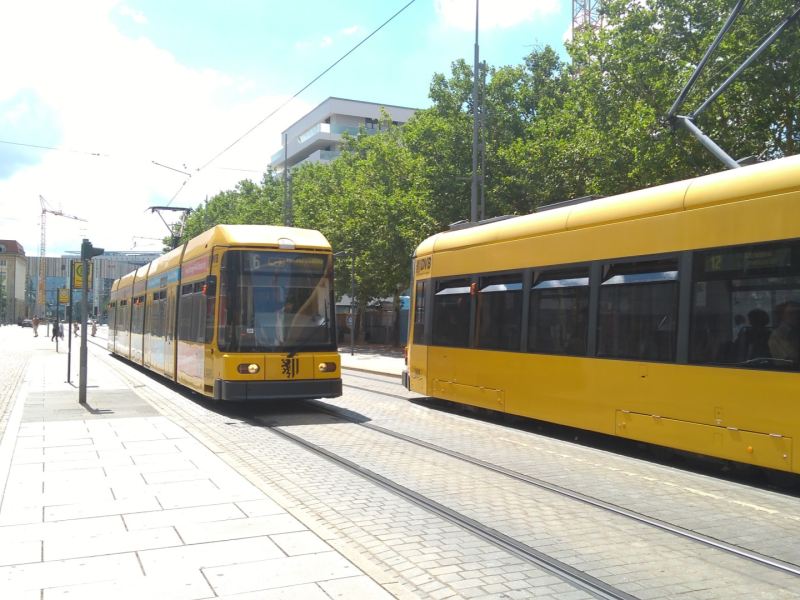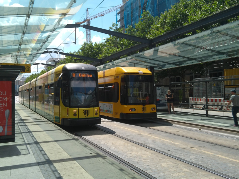 Toen de 2541 wegreed, kwam Bombardier-tram 2811 op lijn 11 naar Bühlau net aanrijden.