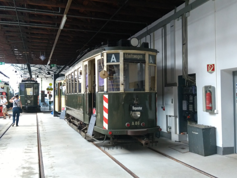 Binnenin het museum staan de wat oudere trams. In het gedeelte dat echt als museum is ingericht staan de wat kleinere dingen, zoals deze Arbeitswagen A 86 en in de achtergrond Arbeitswagen A 1.
